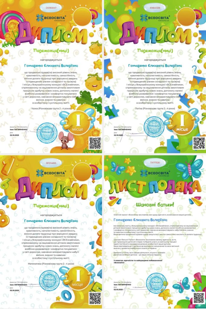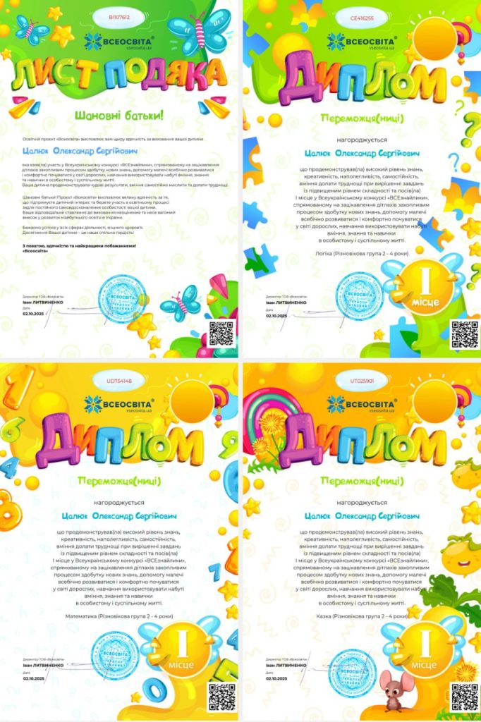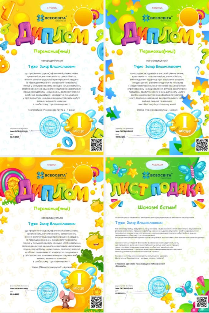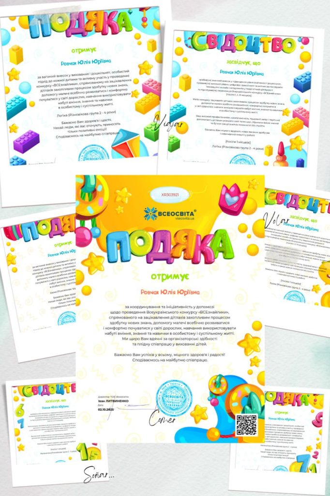 В рамках атестації педагогічних працівників 2025/2026 н. р. ¸ вихователь Ровчак Ю.Ю. разом з дітьми та батьками різновікової групи прийняла участь  в олімпіаді  для дошкільнят «Всезнайлики»  в жовтні місяці 2025 року.
